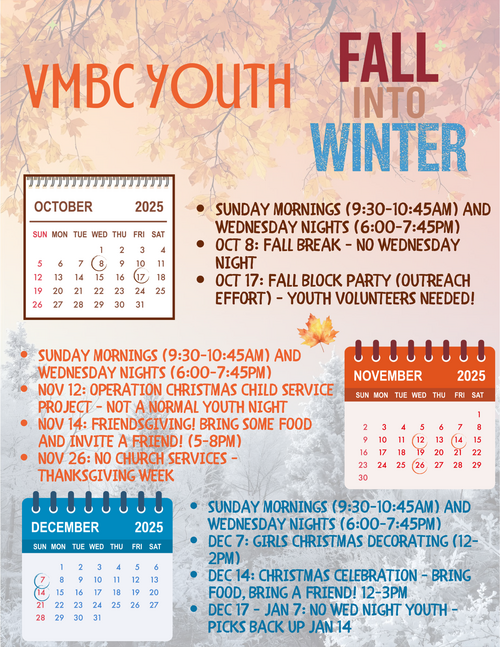 The youth ministry at Village Meadows Baptist Church hosts and participates in various activities throughout the year to build strong connections not only with God, but with each other as well. Some of our highlighted events are: